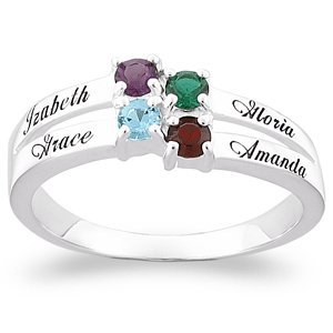 Personalized Valentines Day Gift. Sterling Silver ring is set with the name and birthstones of cherished family members. Faceted Austrian crystal are prong set on a polished split band. Personalize with 2 to 6 names (up to 10 letters per name)and the corresponding birthstones. Available in full sizes 5 thru 12.