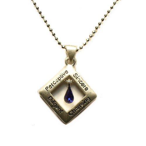 This unique artistic design teardrop birthstone pendant is both stylish and fashionable. It features a sparkling faceted birthstone teardrop Saphhire pendant for September as well as 4 inscribed traits; Perceptive, Sincere, Diligent, and Charming. The pendant is on a 16" diamond-cut ball chain with 2" extender. The pendant comes packaged in a colorful, ready to give gift box. Whether for yourself or as a gift for someone special, this pendant will make a nice addition to a wardrobe.
