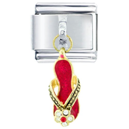 Show off your personality, hobbies, or significant affiliations with this Pugster Red Sandal Flower Rhinestones Dangle Italian Charm. This stainless steel charm features a dangling sandal in red decorated with a flower and Austrian rhinestones. Crafted of the finest stainless steel with soldered faces (as opposed to less durable glue), these charms are sure to be a hit as you build your Italian charms bracelet. You can build your bracelet all at once, or allow it to gradually evolve over the years. Either way, Italian charms bracelets are a great way to express your enduring values and style. Also a great gift for people who like to wear sandals. Crafted and authenticated by Pugster (TM) Inc., Red Sandal Flower Rhinestones Enamel Italian charms are available for both retail and wholesale purchase in our store and are compatible with Italian charms from all major brands.