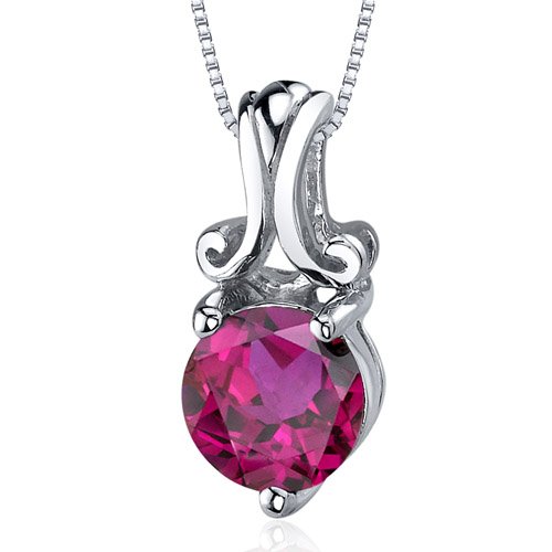 Center Stone: Lab Created Ruby, Round Cut, 7 mm diameter, 1.75 carats, Pigeon Blood Red Hue with Brilliant Sparkle. Pendant: 1.50 grams, Pure Sterling Silver with .925 stamp, Pendant features exceptional Design, Craftsmanship and Rhodium finishing. Perfect gift for Mothers Day, Birthdays, Valentines Day, Graduation, Christmas or just about any other occasion. Money Back Guarantee. Includes a 18 inch Sterling Silver Box Chain, Signature Gift Box & Free SHIPPING, style SP9508