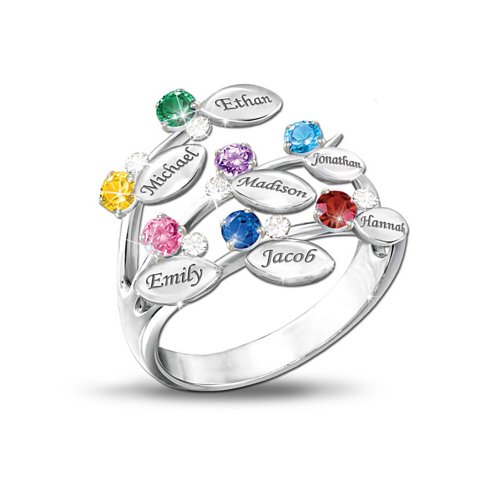 This personalized family ring lets you design your own ring to create a "family tree" that's yours alone! Each of these family birthstone rings features a unique branch motif with leaf designs, in a style that is individually customized to represent your loved ones. In each leaf design, this personalized ring pairs an engraved family name with a loved one's cubic zirconia birthstone for a very special custom look. This family birthstone ring is a fine jewelry exclusive from The Bradford Exchange that provides a beautiful way to express a family love with deep roots.Exquisitely crafted in solid sterling silver, this personalized family ring presents gleaming individual leaf designs that showcase up to 7 engraved names of loved ones along with their cubic zirconia birthstones. Then clear CZ "dewdrops" are added to the leaf design for extra sparkle in this unique family birthstone ring design! Enjoy the thrill when you design your own family ring from the various leaf designs offered, knowing that your ring will be one-of-a-kind, just like the loving family that inspired it! Demand is expected to be high for this unusual family birthstone ring, so be sure to order now!