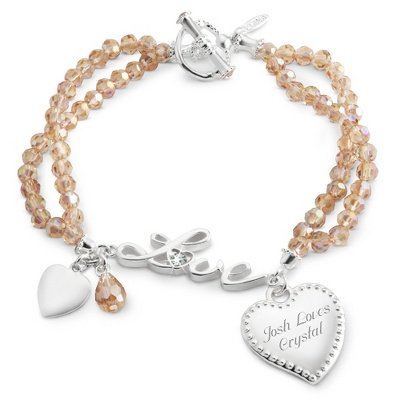 Faceted pink beads create drama and sparkle, perfectly complementing the silver "Love" charm incorporated into this bracelet's band and accented with a stunning CZ crystal. This bracelet a unique gift for your sweetheart or wife. And when it's engraved with a reminder of a special moment you've shared, it'll be a memorable gift she'll wear every day. Engraved Gift.