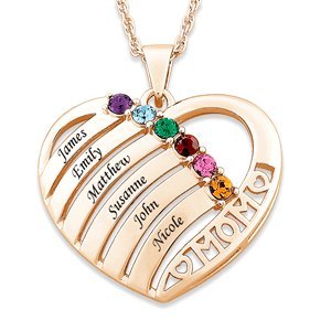 Personalized Valentines Day Gift. Heart Necklace, Heart Jewelry The Perfect Gift for Mom A rainbow of family birthstones leads to Mothers in this unique Mothers pendant set with faceted Austrian crystal birthstones and engraved with the names of her children, grandchildren, or loved ones. The luminous 14K Gold plated heart is cast with Mothers along the side. Choose up to 6 names (10 letters per name) and corresponding birthstones to personalize. Pendant is suspended on a 20" rope chain. A white crystal will be placed when no personalization is chosen. Personalization starts from top to bottom. Heart is 1 1/8" tall and 1 1/4" wide.